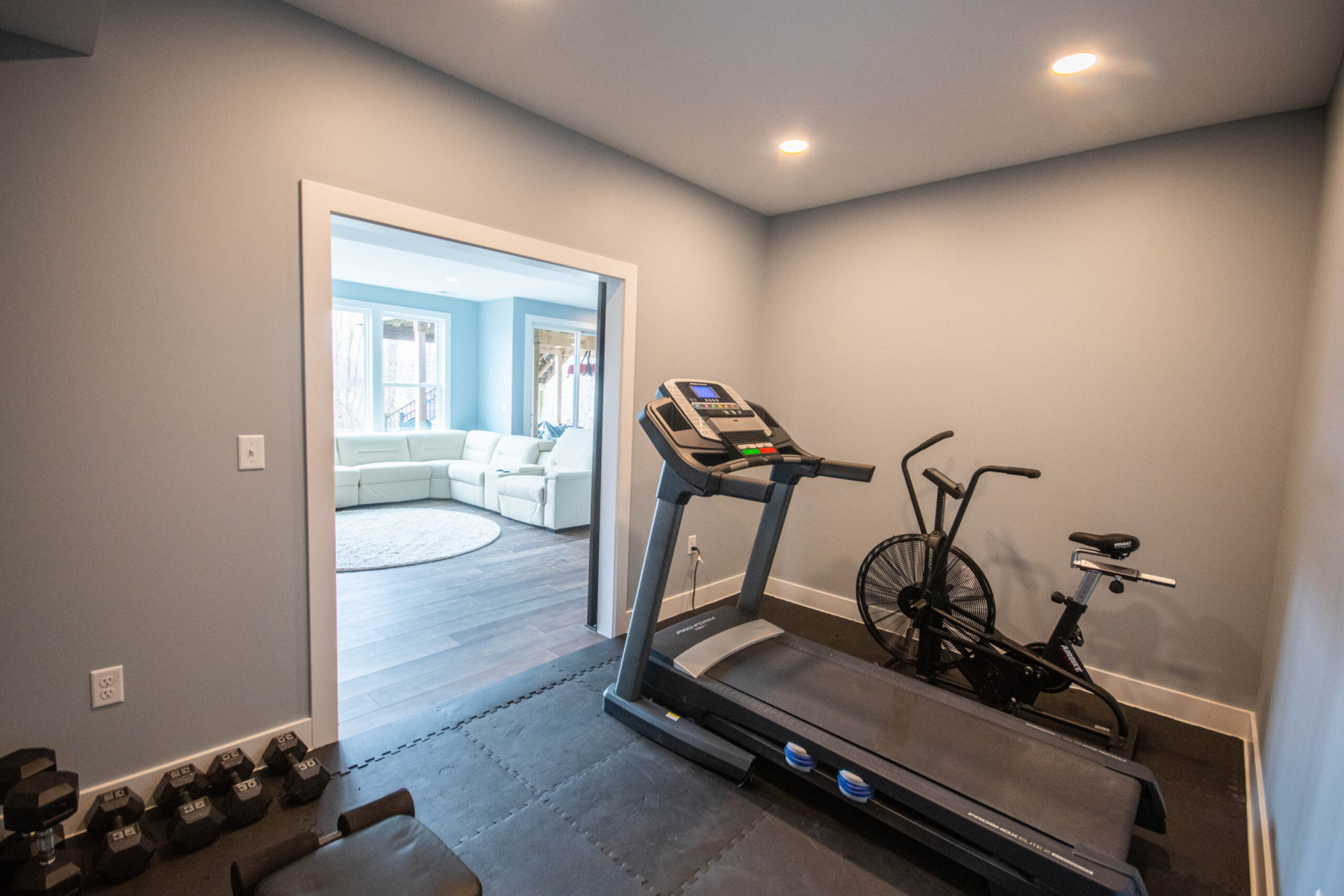 This large home had a walkout basement that had plenty of space requiring finishing.  A combination of work and play, the clients needed space for relaxing, entertaining, working and working out.  One room was even transformed into a comfortable library to inspire both reading and unwinding.